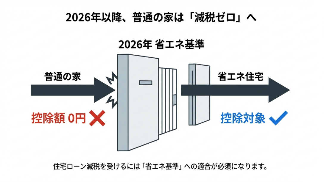 2026年の省エネ基準という壁により、普通の家は控除額0円になり、省エネ住宅のみが控除対象となることを示す比較イラスト。