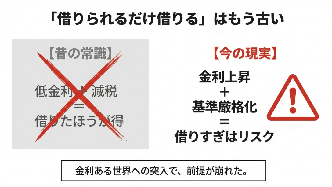 「借りられるだけ借りる」という昔の常識に×印をつけ、金利上昇局面では「借りすぎはリスク」という今の現実を対比させた解説図解。
