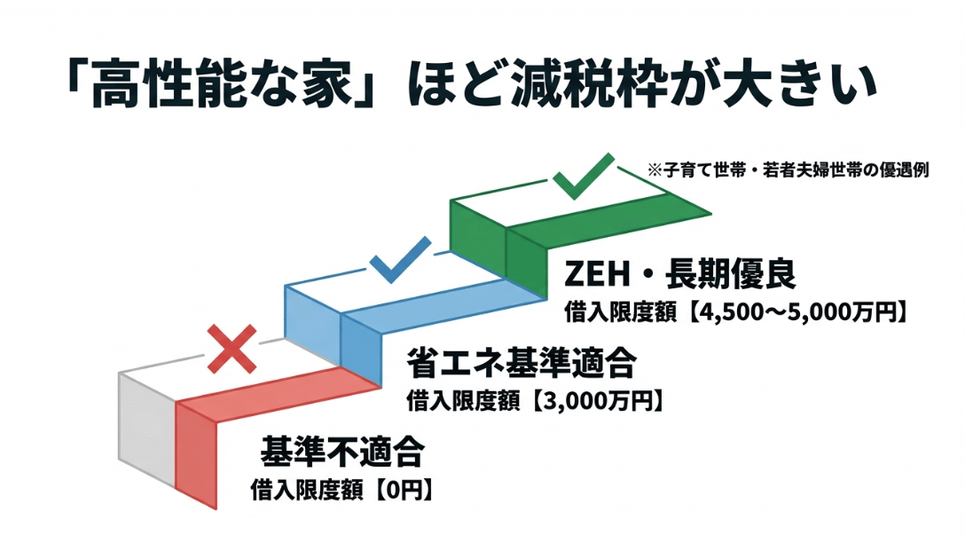 住宅の性能が高いほど減税枠が大きくなることを示す階段状の図。基準不適合は0円、省エネ基準は3,000万円、ZEH・長期優良は4,500~5,000万円の限度額。