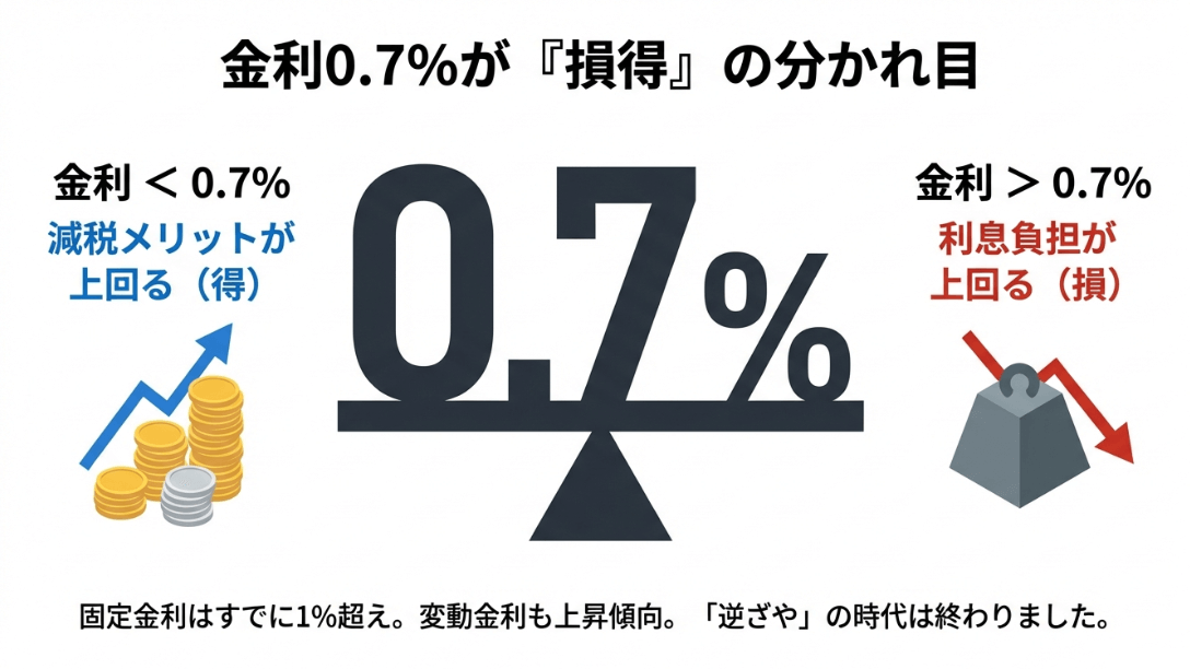 金利0.7%を境に、減税メリットが勝るか利息負担が勝るかを示す天秤の図。変動金利の上昇による「逆ざや」終了の警告。