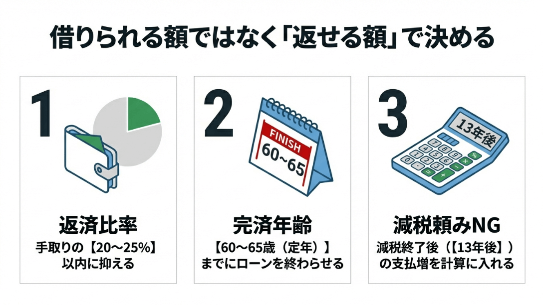 返済比率を手取りの20~25%以内に抑える、60~65歳までに完済する、13年後の減税終了後の支払い増を計算に入れるという3つのポイント。