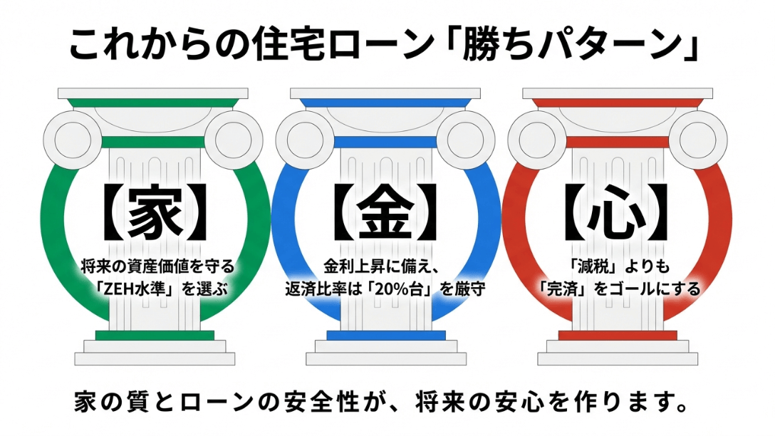 家・金・心の3軸でのまとめ。ZEH水準の選択、返済比率20%台の厳守、完済をゴールにすることを推奨。