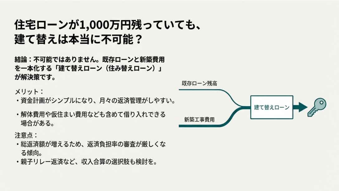- 住宅ローン残債がある状態での建て替え手順と資金調達の方法