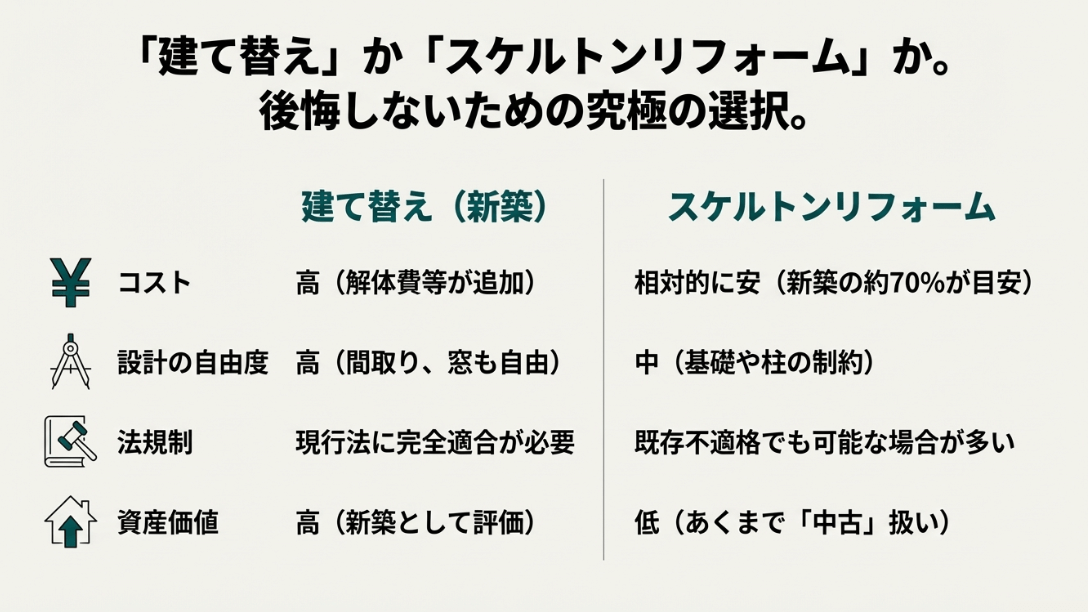 - 選択:「建て替え」に固執せず、「スケルトンリフォーム」という合理的な選択肢も検討する。