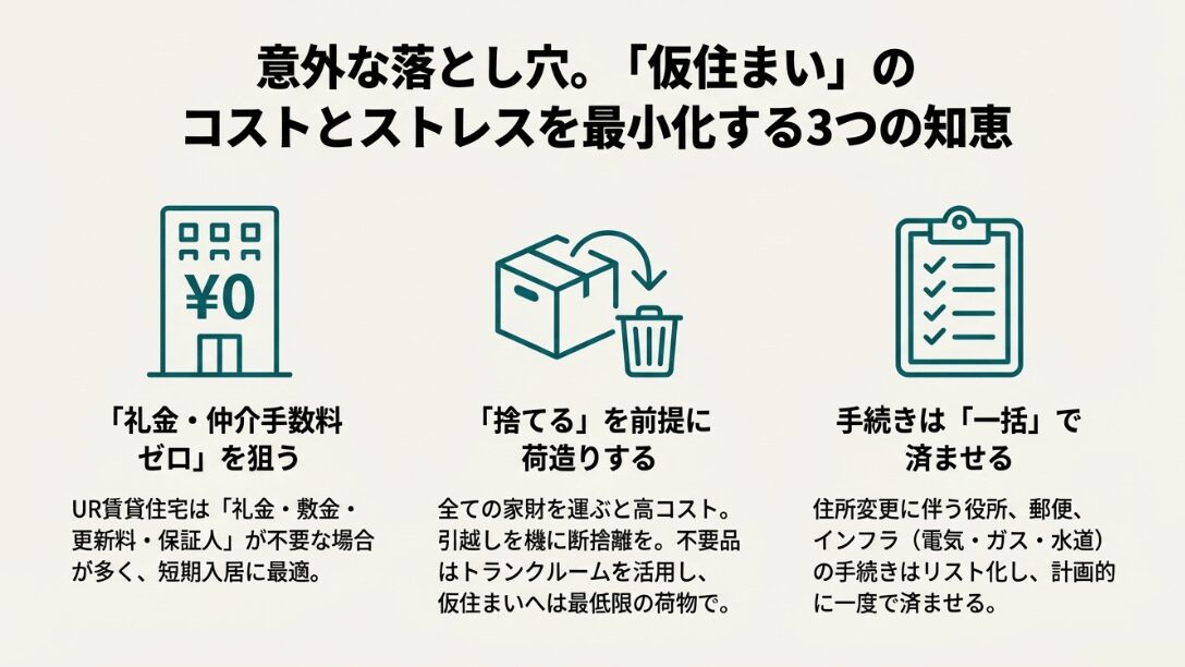 季節外れの衣類やアルバム、捨てられない思い出の品などは、空調設備の整ったトランクルーム(レンタル収納スペース)に預け、仮住まいには「必要最低限の生活用品」だけを持ち込むようにしましょう。