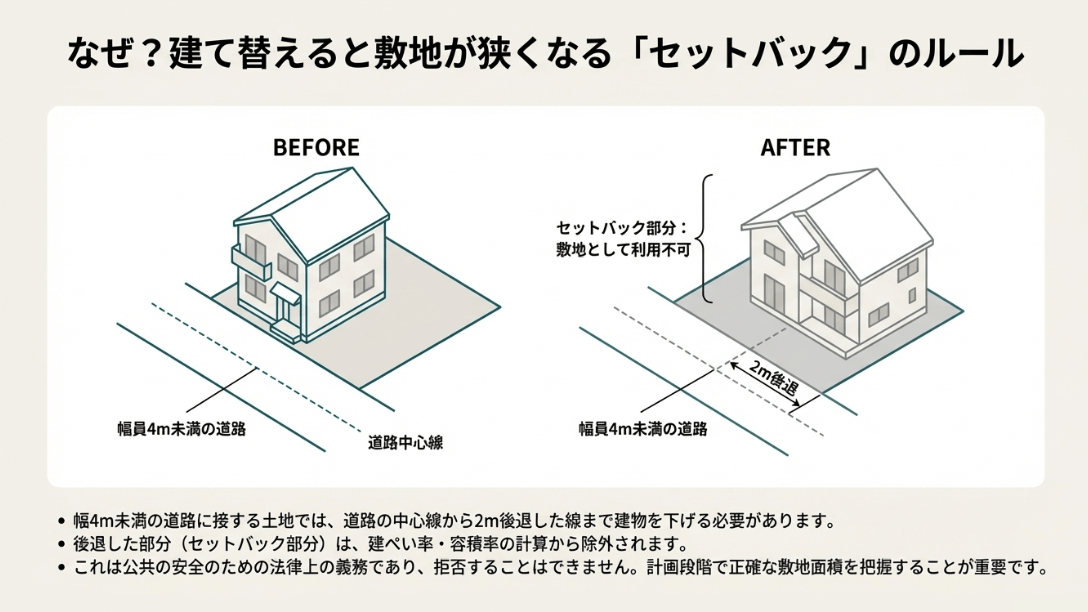 「たかが数十センチ下がるだけでしょ?」と軽く考えてはいけません。セットバックの真の恐ろしさは、敷地面積が減ることによって「建てられる家の大きさ」が強制的に縮小される点にあります。