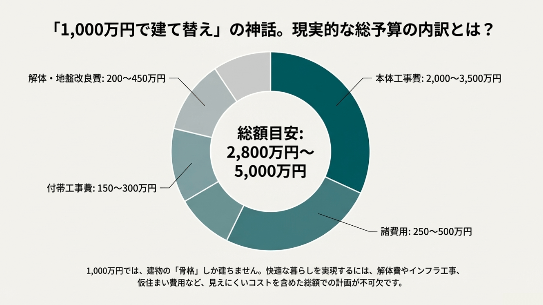 以下に、一般的な30坪程度の木造住宅を建て替える場合の概算費用構造を整理しました。これを見れば1000万円台という予算がいかにシビアかが分かります。