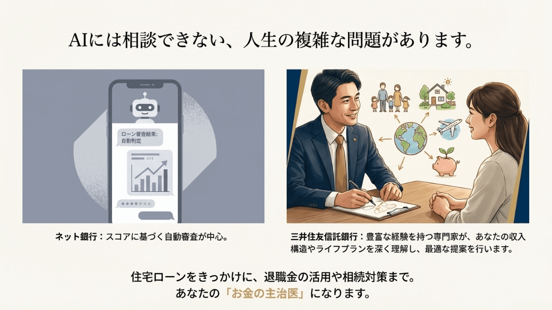 最近の住宅ローン選びは、利便性を求めてネット銀行へ流れる傾向がありますが、一方で三井住友信託銀行のような店舗を持つ銀行の価値が見直されている側面もあります。