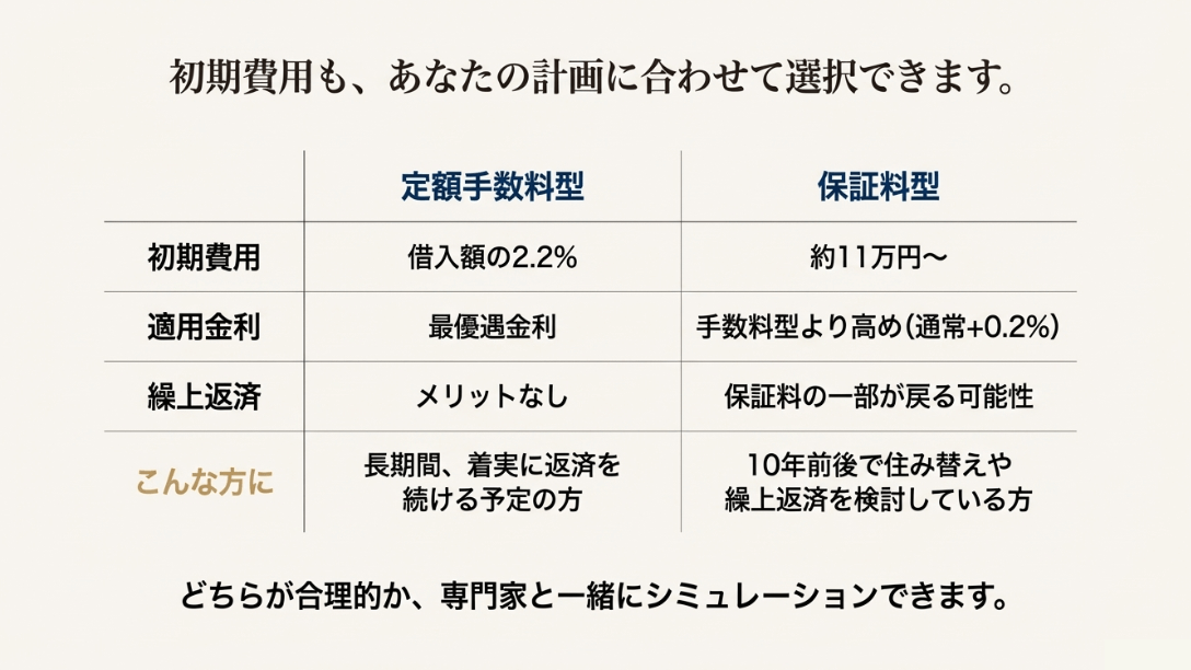 どちらが得かは、将来の「住み替え」や「繰上返済」の予定に左右されますが、一生この家に住むなら手数料型、10年後には売却する可能性があるから保証料型、といった具合に自分のライフプランに合わせて慎重に選ぶ必要があります。