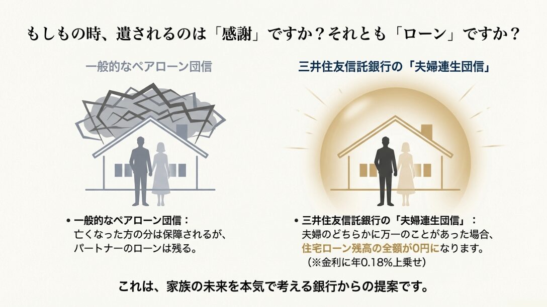 しかし、ペアローンには大きな落とし穴があります。それは、一般的な団信では「自分の身に何かあっても、パートナーの債務はそのまま残る」という点です。これを解消し、夫婦に真の安心を提供してくれるのが、三井住友信託銀行の「連生団体信用生命保険(通称:連生団信)」です。