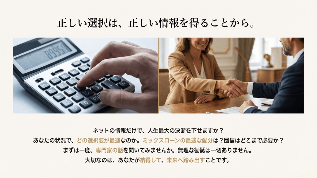 例えば、今の家を売って新居に買い換える場合の「住み替えローン」や、親からの贈与を受ける際のアドバイスなど、ネットの自動計算だけでは解決できない悩みに寄り添ってくれるのが信託銀行の強みです。