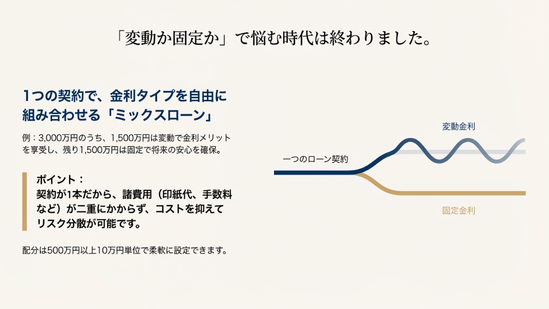 しかし、同行では「1本の契約」の中でミックスが完結するため、諸費用を大幅に節約できるというメリットがあります。これは特にコスト意識の高い層から非常に高く評価されているポイントです。