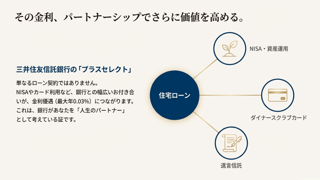 このプランは単にローンを借りるだけでなく、銀行側の他のサービスも併用することで金利をさらに引き下げるというものです。具体的には、投資信託の自動購入プランへの加入や、三井住友信託ダイナースクラブカードの作成、外貨積立サービスの利用などが条件として設定されています。