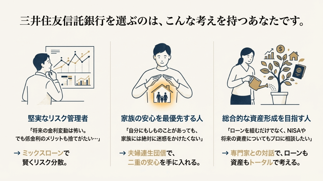 ここまで三井住友信託銀行の住宅ローンについて様々な角度から解説してきましたが、最終的に以下のような特徴を持つ方に「最適解」としておすすめしたいと感じています。