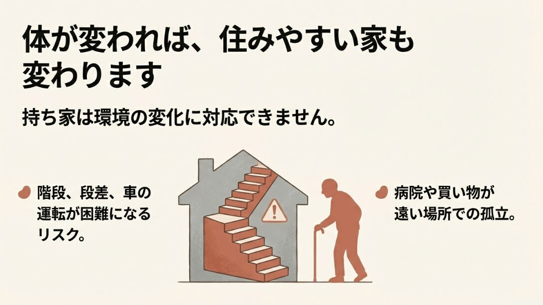 例えば、現役時代は通勤に便利な都市部がベストですが、退職後は静かな環境や、あるいは逆に病院やスーパーが徒歩圏内にあるコンパクトな街へ移るなど、状況に合わせた軌道修正が容易です。