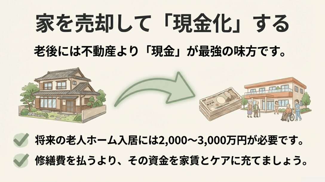 大きな家を売った代金で駅近の小さな中古マンションを買うか、質の高い高齢者向け賃貸に入るという潔い決断こそが、老後の不安を解消する最も確実な出口戦略になるでしょう。