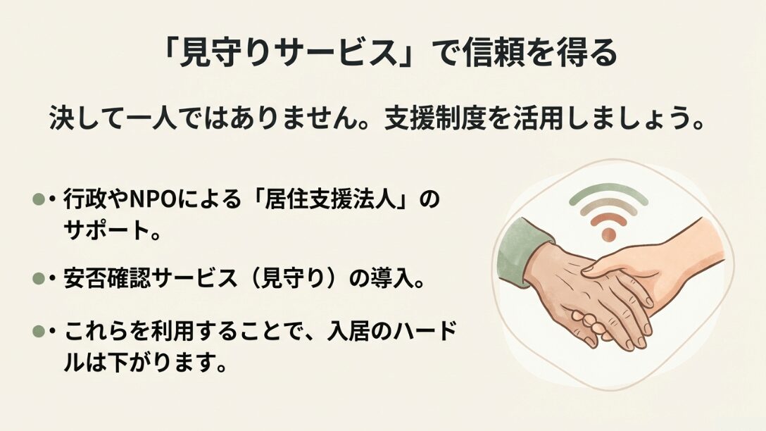 また、高齢者の入居支援に特化した「居住支援法人」に相談するのも賢い戦略です。彼らは家主との交渉を代行してくれたり、保証人の代わりになってくれるケースもあります。