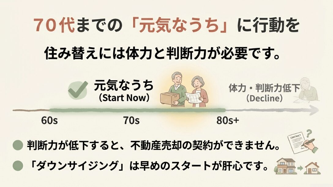 「まだ住めるから」と先延ばしにしている間に不動産価格が下落したり、自分自身が病気になって動けなくなったりすることは、最も避けるべきシナリオです。