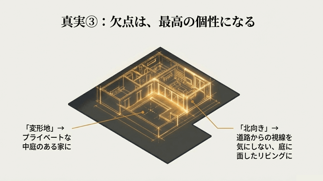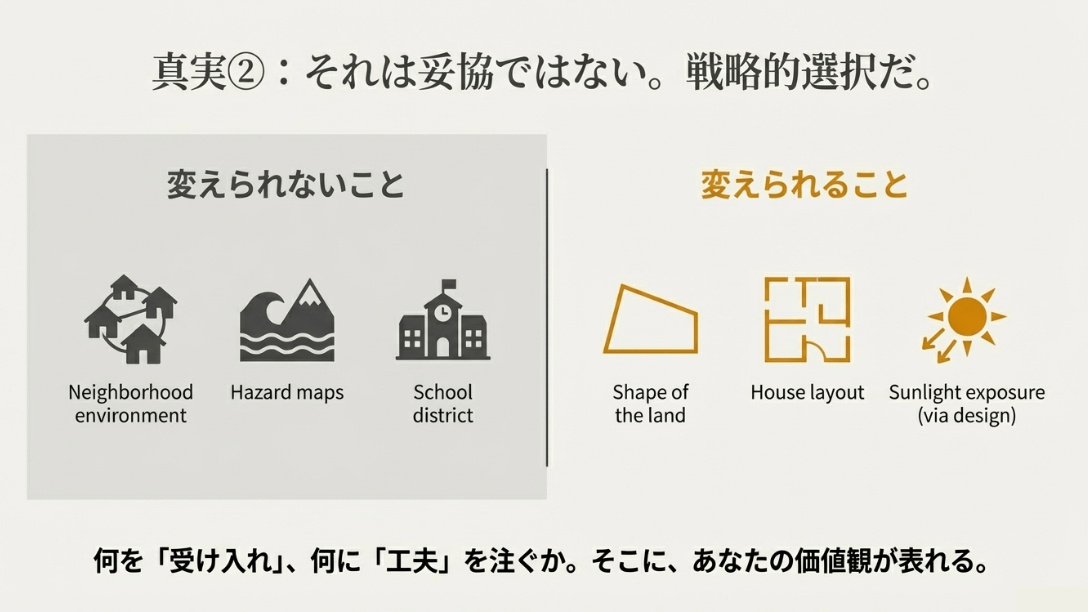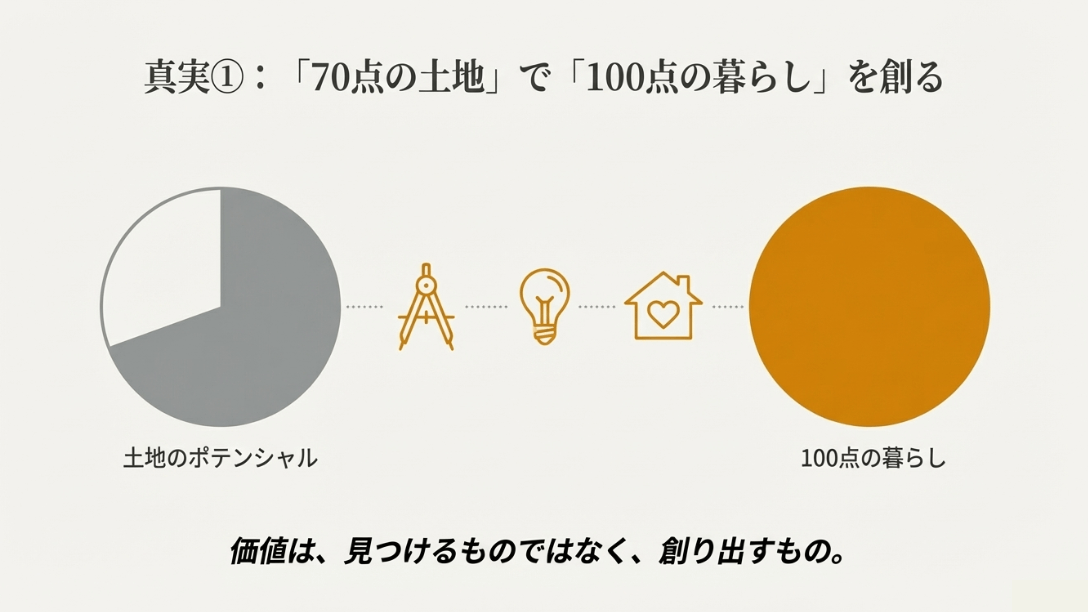 - 100点満点を求めず、70点の土地を設計で100点にする発想を持つ