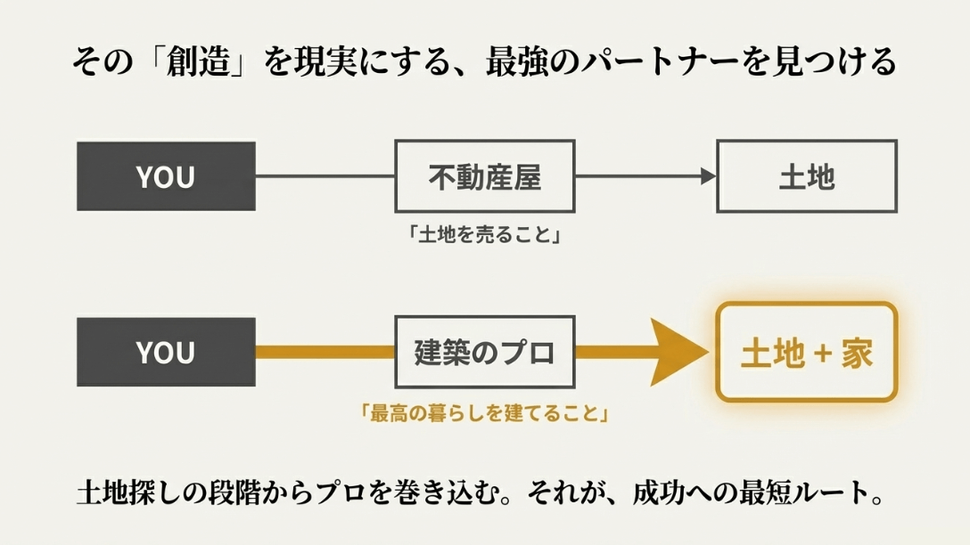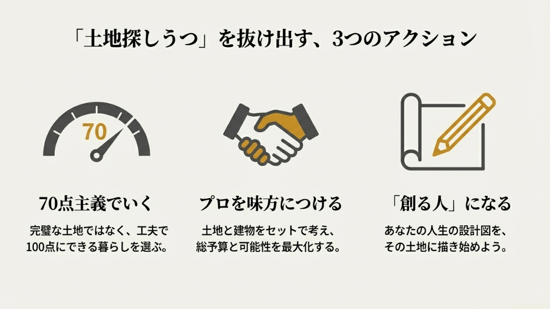 70点の土地をベースに、どうやって100点、120点の家にしていくか。そのクリエイティブな思考に切り替わったとき、あなたの土地探しは一気に進展します。