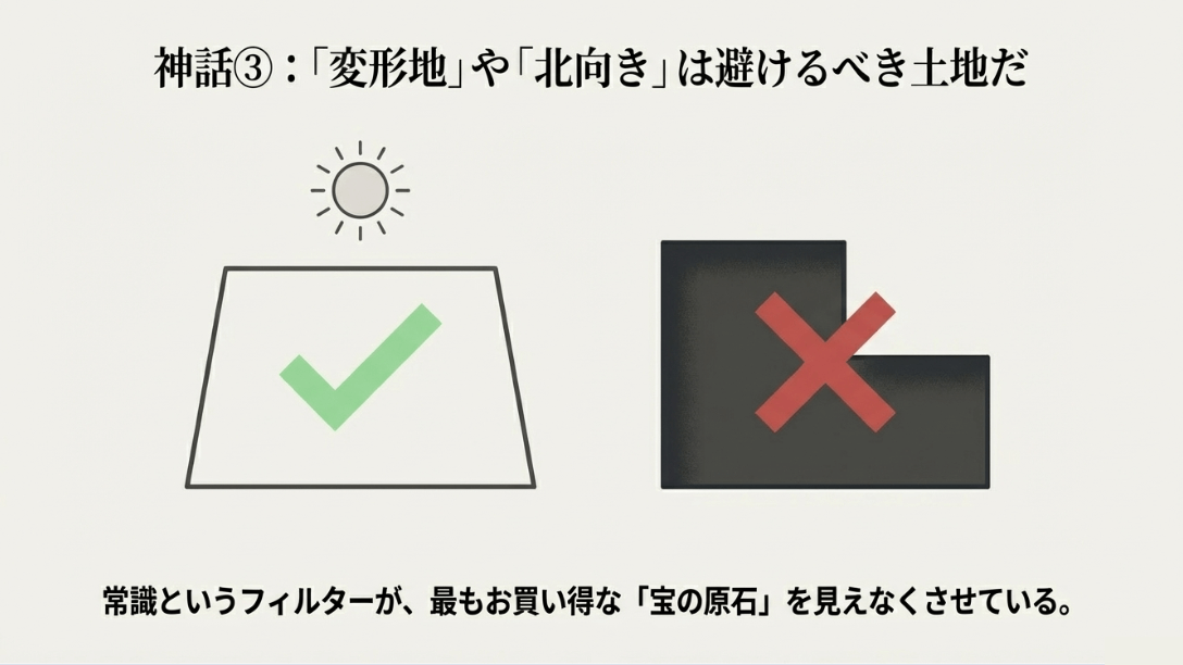 | 土地の形(変形地) | 価格が大幅に安くなる | 建築家に依頼して個性を出す、デッドスペースを収納にする |