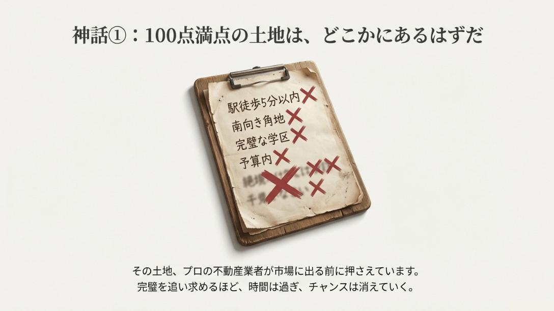 期間が長引いてしまう人の特徴として最も多いのは、「100点満点の土地」を追い求めすぎているケースです。駅からの距離、日当たり、広さ、周辺環境、そして価格。すべての条件を完璧に満たす物件は、プロの不動産業者ですら滅多に出会えません。