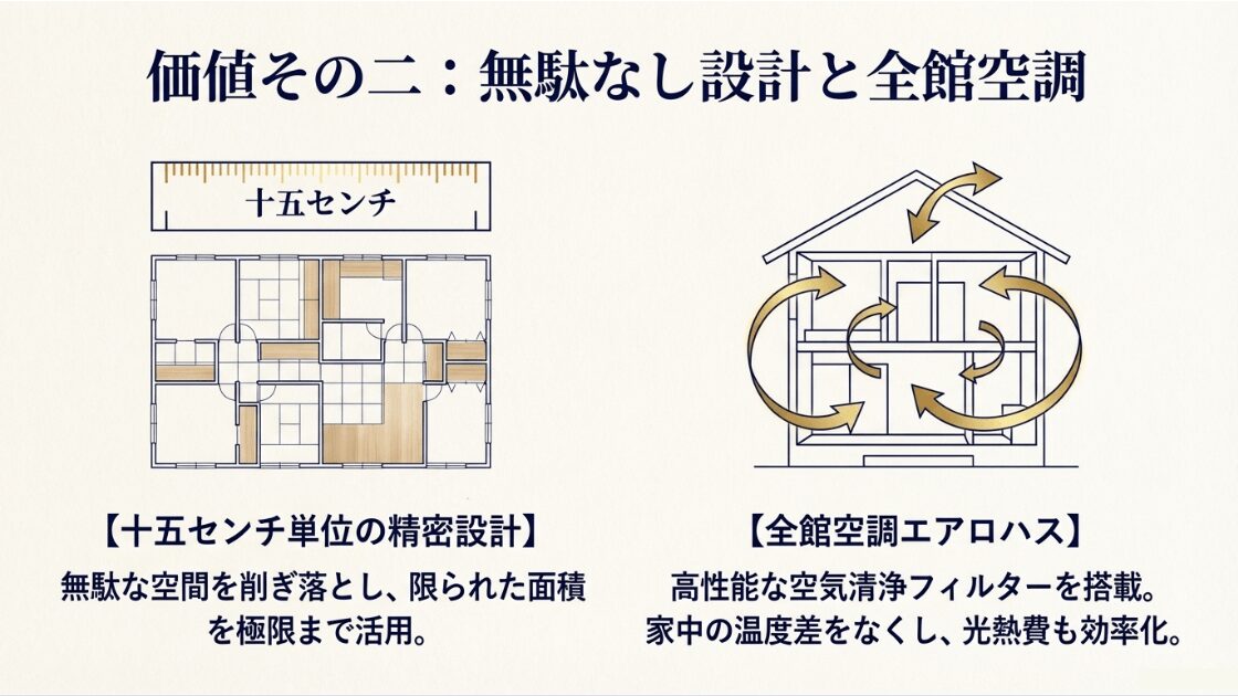15cm単位の精密な間取り設計イメージと、家中を快適な温度に保つ全館空調エアロハスの空気循環を示す図解