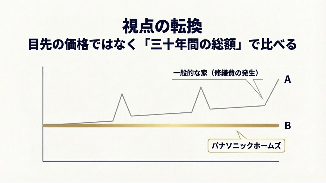 一般的な住宅とパナソニックホームズの家における、30年間の修繕費発生タイミングとトータルコストの推移を比較したグラフ