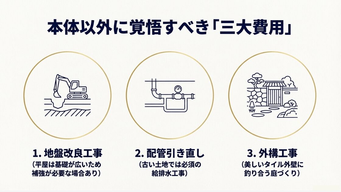 地盤改良工事、配管引き直し、外構工事という、平屋建築において建物本体以外に発生する主要な費用のイラスト