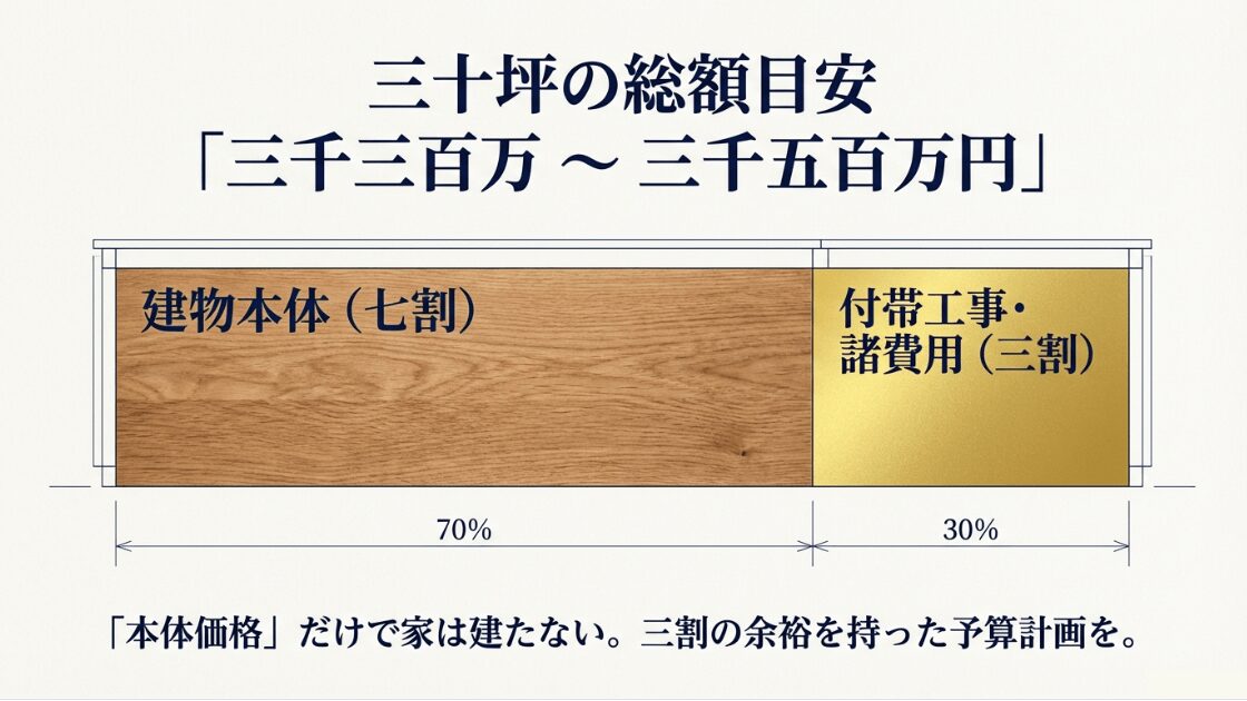 延床面積30坪の平屋の総額目安が3,300万〜3,500万円であること、および本体価格7割・諸費用3割の内訳を示すグラフ