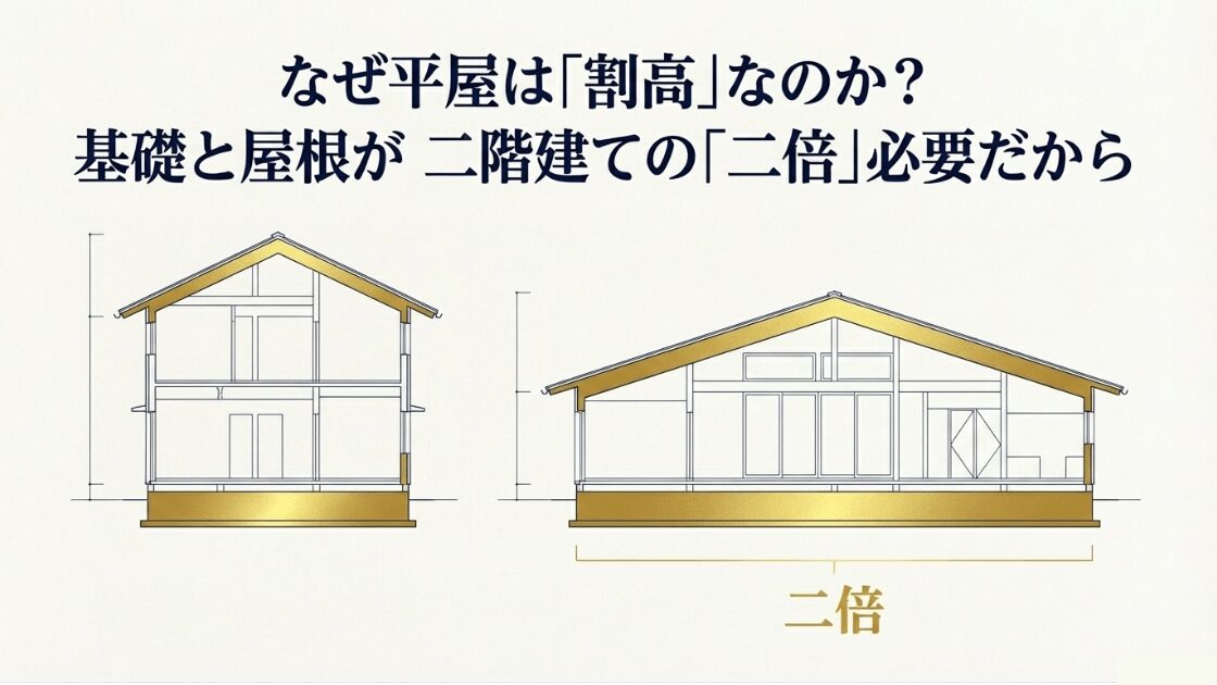 平屋特有の事情として、2階建てと比較して基礎面積と屋根面積がちょうど2倍になる点が挙げられます。同じ延床面積30坪でも、2階建てなら基礎は15坪分で済みますが、平屋は30坪分必要です。