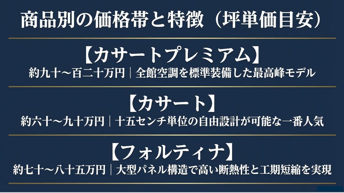 カサートプレミアム、カサート、フォルティナの各商品ごとの坪単価目安と特徴をまとめた比較リスト