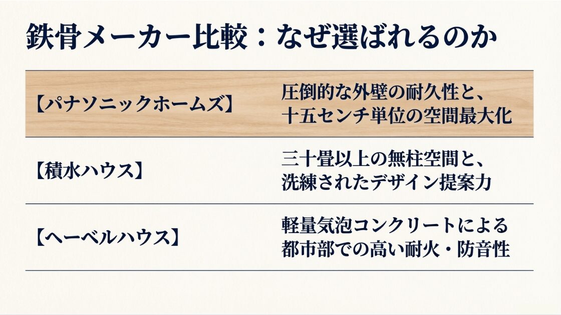 パナソニックホームズ、積水ハウス、ヘーベルハウスの強み(外壁耐久性、大空間、耐火性等)を比較した表