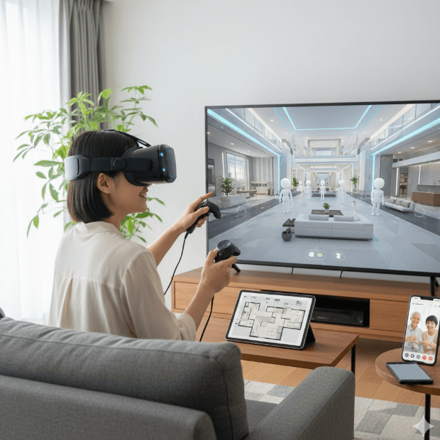 「ここのリビングは広いね」「二世帯にするならこの間取りはどうかな」と、音声チャットやテキストチャットでリアルタイムに会話しながら見学できるのは、デジタル空間ならではのメリットです。