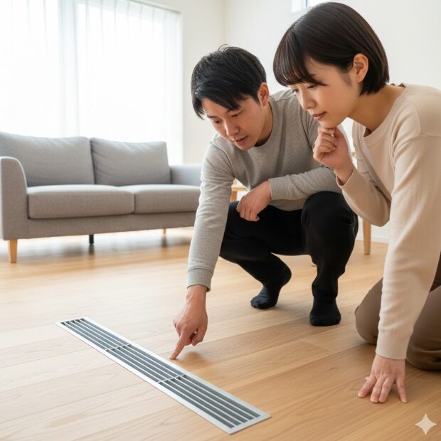 快適エアリーを採用する場合、部屋の隅や窓際に床下からの吹き出し口(ガラリ)が設置されます。これが意外と大きく、その上には家具やラグを置くことができません。