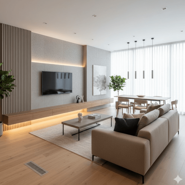 例えば、壁掛けテレビの背面に調湿建材の「エコカラット」をあしらって高級感を演出する方法や、空間を広く見せるための低めの家具配置、間接照明を使ったリラックス空間の作り方などです。