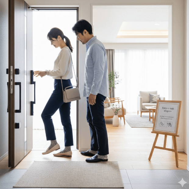 • 清潔な靴下を着用: スリッパを用意されることがほとんどですが、床材の質感(無垢材や挽板の感触など)を確かめるために、あえて靴下で歩くことを推奨される場面もあります。穴が開いていたり汚れていたりする靴下は避け、清潔なものを履いていきましょう。夏場のサンダルの場合も、靴下を持参するのがマナーです。