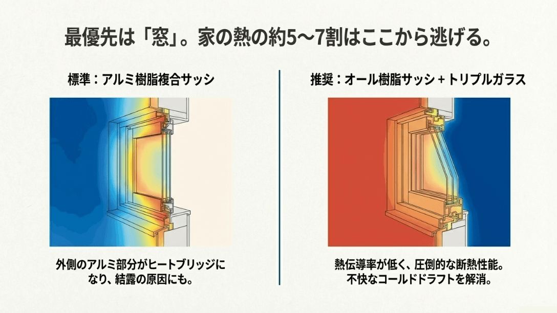 住宅の断熱性能を語る上で、最も重要でありながら最も熱が逃げやすい「最大の弱点」が窓(開口部)です。