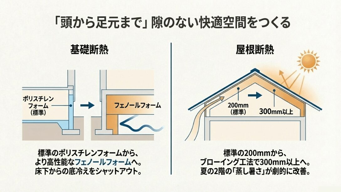 鉄骨の弱点を物理的にカバーするこのシステムは、標準仕様にも組み込まれていますが、グレードアップの際はこの「包囲網」をより強固にすることが意識されます。柱をまるごと包むことで鉄を通じて熱が逃げるのを最小限に抑えるわけです。