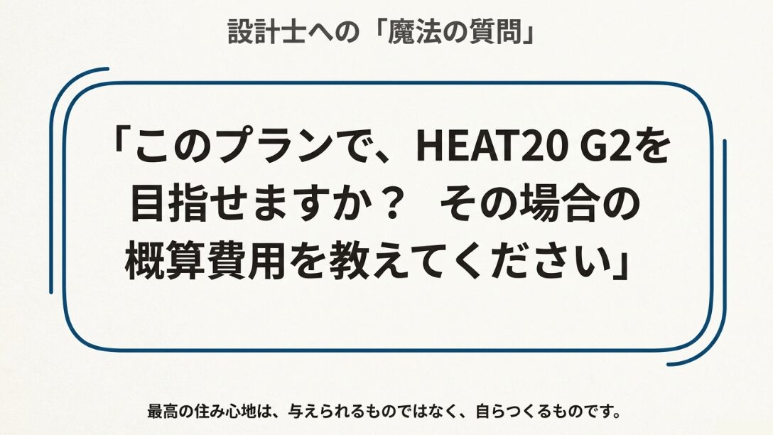 個人的には、まずは担当設計士に「わが家でHEAT20 G2を目指した場合、Ua値はいくつになり、差額はいくらになるか?」というシミュレーションを出してもらうことをおすすめします。その数値を基に、予算と快適性のベストバランスを見つけてください。
