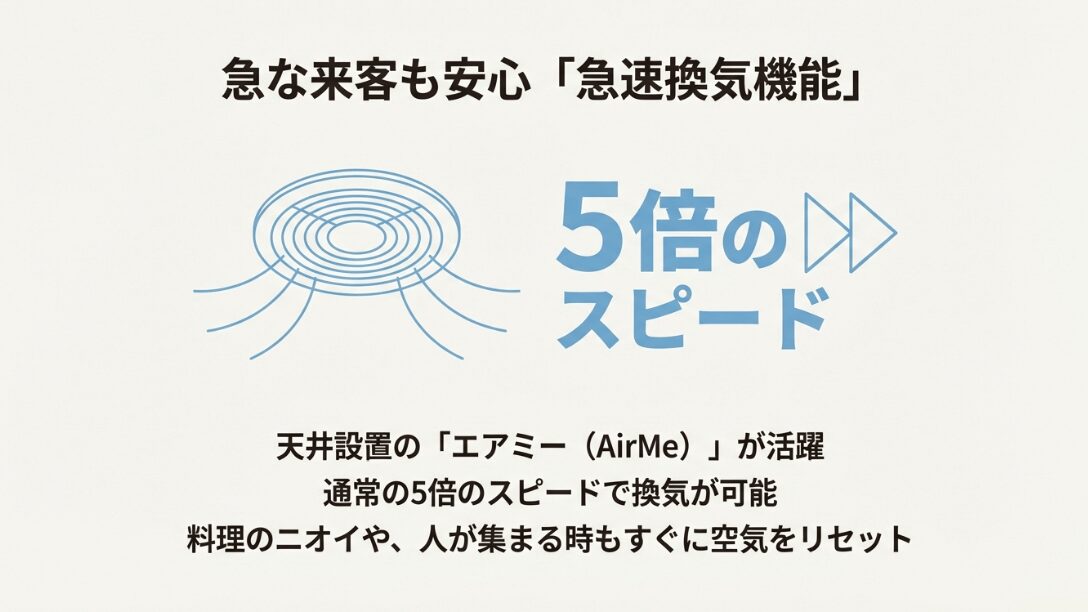 天井設置の「エアミー(AirMe)」により、通常の5倍のスピードで換気が可能であることを示すイラスト。料理のニオイや人が集まる時のリセットに有効。