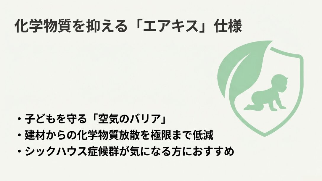 子どもを守る空気のバリアとして、建材からの化学物質放散を極限まで低減する「エアキス」仕様のメリットを説明するテキストスライド。
