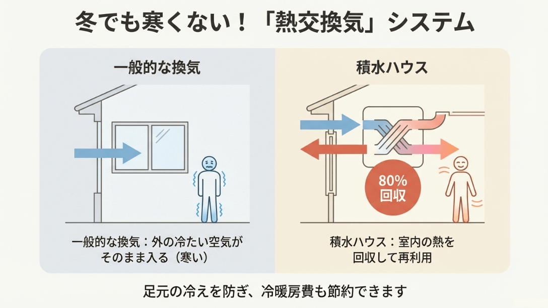 一般的な換気は冷たい空気がそのまま入るのに対し、積水ハウスは室内の熱を80%回収して再利用し、足元の冷えを防ぐ仕組みの解説図。