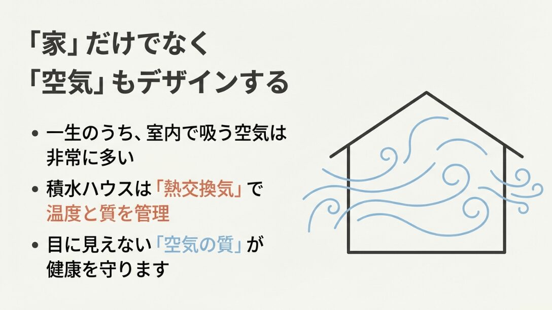 家のイラストの中に空気の流れが描かれ、「一生のうち室内で吸う空気は非常に多い」という事実と、熱交換気で温度と質を管理する方針を示したイメージ図。