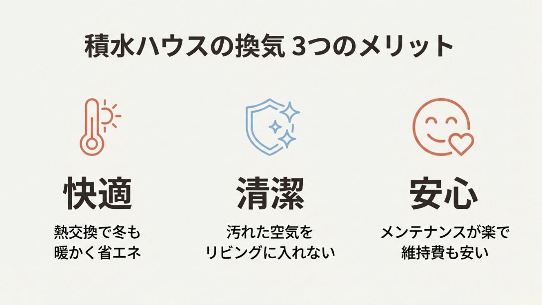 「快適(熱交換)」「清潔(ゾーニング)」「安心(低維持費)」という、積水ハウスの換気システムが持つ3つの主要なメリットをまとめた図。