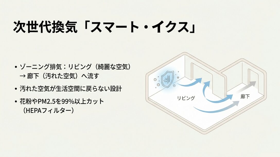 積水ハウスのスマートイクスが「次世代室内環境システム」と呼ばれる理由のひとつに、機械に頼り切るのではなく「空気の流れをデザインする」という建築的な工夫が組み込まれている点が挙げられます。それが「換気ゾーニング」です。実はこれがものすごく理にかなった設計なんです。