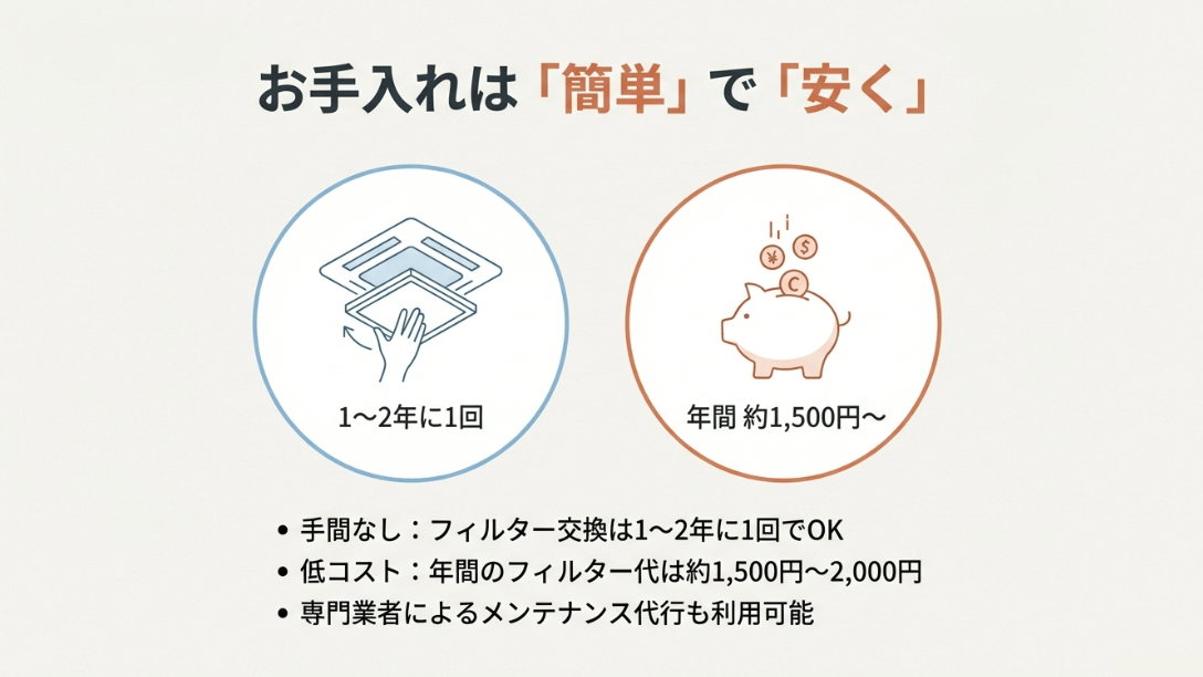 • フィルターの定期的な掃除と、1〜2年ごとの交換費用(年間約2万円〜)が必要