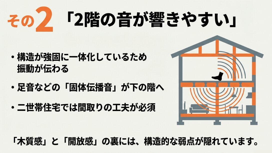 当然、住友林業も対策として高遮音床を導入していますが、構造体そのものが振動を伝えやすい性質を持っているため、完全に音を消すのは難しいのが現状です。