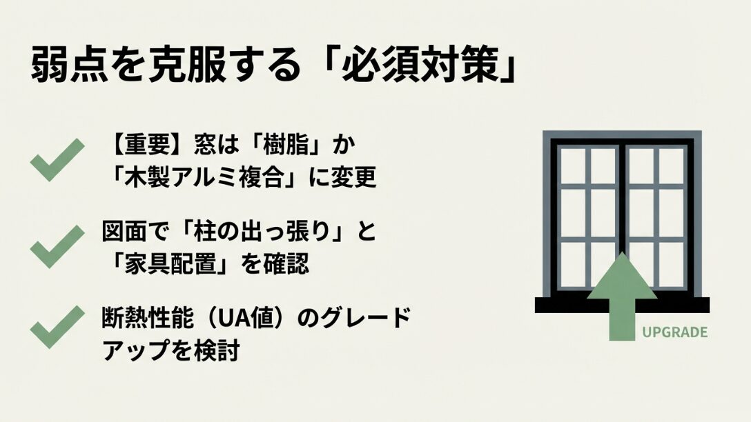 これを防ぐには、予算を投じてでも「樹脂サッシ」や「トリプルガラス」へのアップグレードが不可欠です。私が見た限り、この断熱への投資を惜しんだ施主さんほど、冬の寒さに後悔している印象があります。