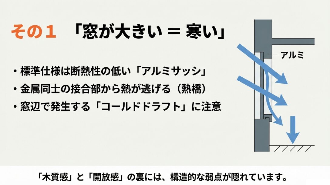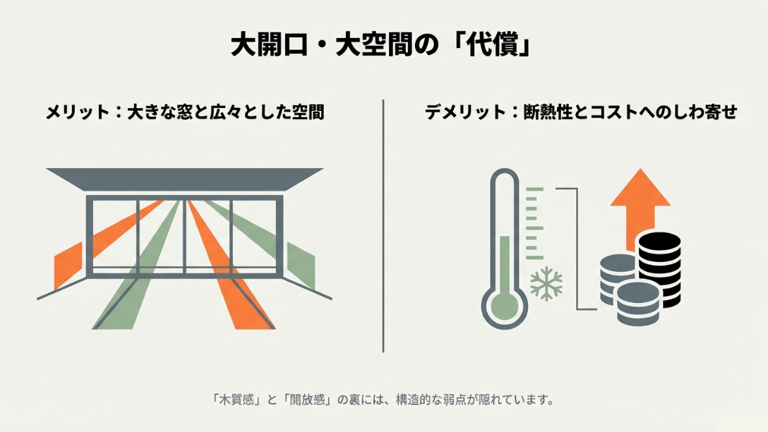 大きな窓と広々とした空間というメリットの裏側にある、断熱性とコストへの影響を説明するイメージ画像。